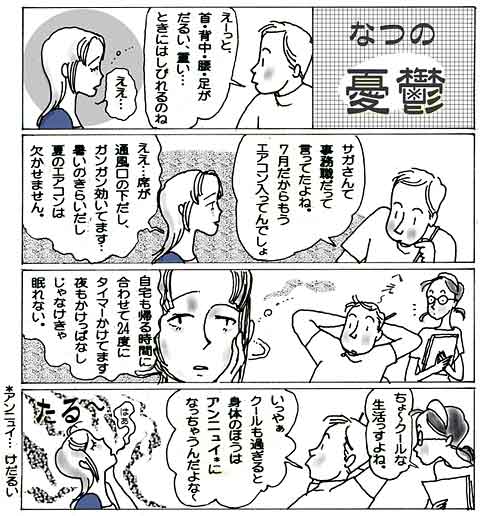 地球温暖化のせいか、ここ数年暑い夏が続いています。しかも早々と7月から猛暑というのも珍しくありません。当然冷房が不可欠ですが、サガさんのようにいわゆる「冷房病」になる方がいます。「冷房病」というのは正式の病名ではありませんが、体温調節のバランスが崩れて、自律神経失調症のような症状が出てきます。サガさんの症状のほかにも頭痛、食欲不振、肩こり、疲れ易いなどの症状が出ます。また、屋外との温度差が激しいためかぜをひきやすくなり、冬より夏にかぜがはやるとも言われています。エネルギーの節約の面からも冷やし過ぎないようにしましょう。(Dr.平野) |