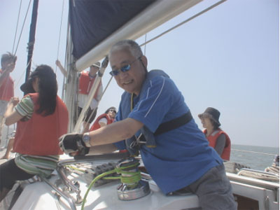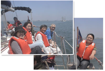 ヨット=揺れる、船酔いという心配は無用。この日の海は穏やかで、最高!!こんな日に当たることはめったにないそうです。梶原先生は、帆を張ったり、帆の向きを変えたり色々な作業で忙しく動いていらっしゃいました。仕事場とは違いとても楽しそうな表情が印象的でした。私たちは何を手伝えば良いかわからず、ただ座っているだけでしたが、途中で風向きが変わって船が傾くと、足を船の外に投げ出して座るように言われました。これは、ハイクアウトと言って重要な役割なのだそうです。船の操縦にトライさせてもらいました。右にハンドルを切ると右に曲がる、左にハンドルを切ると左へ、当たり前のことなのですが、車の運転とは違い水の上と言うのは何ともいえない爽快感です。東京ディズニーリゾート、お台場、海ほたる、羽田空港、と海上からの贅沢な東京見物を楽しみました。他の船とも出会い、手を振ったりしたのも楽しかったです。大きな帆船にも遭遇しましたが、これはめったにない事だそうでこれまたラッキーでした。海の真ん中は、騒音が無くて驚くほど静かで、ゆらりゆらりと穏やかでのんびりしたヨットの旅でした。
